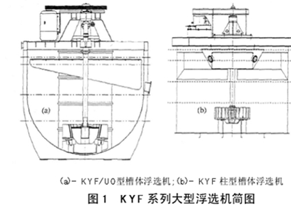 XCF/KYF型浮選機(jī)均屬充氣型浮選機(jī),葉輪直徑小,圓周速度低,可降低功率30-50%;槽內(nèi)設(shè)有一個(gè)空氣分配器,因而空氣分散均勻;葉輪起離心泵作用,可是固體顆粒充分懸浮。
